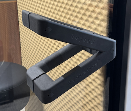 Beyond 1 is designed, manufactured, build for your privacy, reduce distractions, offers a comfort zone, and give you space to do your best. It is very quiet (class A product), with convenient table for laptop, notebook or phone on top of it. Also comes ready for on-line collaboration, video conferencing with vanity light to give you nice, fresh look on camera. You can manage lights, air flow on very intuitive 7” touch screen, it is simple to operate, very inclusive. The Signature™ door handle let’s you naturally and comfortably open/close door even if your hands are busy carrying a notebook or a mug. For sure you will avoid complex motions, so typical for doorknobs (vertical or horizontal ones), instead just reach out at most natural angle for raising hand and grabbing the handle with one hand or both (c.a. 20-22 degrees). Feels really good.